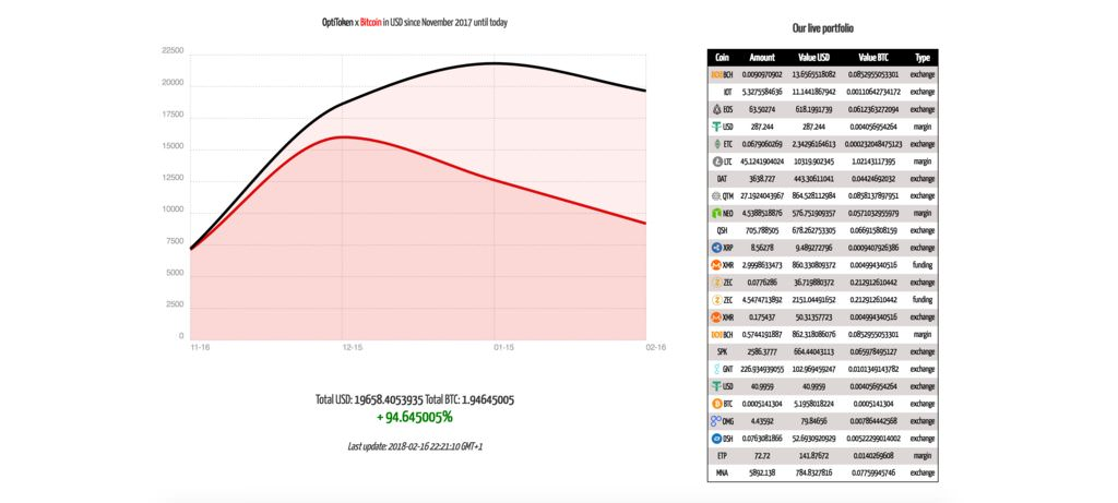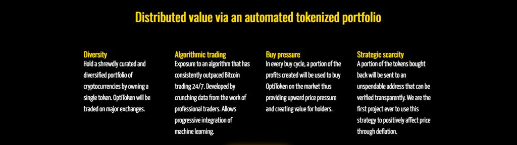 As algorithmically traded cryptocurrencies, Optitoken holders will be exposed to 24/7 trades through codes developed by traders in specified and manually selected cryptocurrency portfolios. The algorithm developed for this child of commerce takes advantage of price changes among a particular group of tokens, known as "Basket," consisting of a number of coin (s) variables that are considered statistically or categorically undervalued. They will also be established and based on several factors based on past growth trends and / or market averages. It will also consider token supplies and market capitalization.