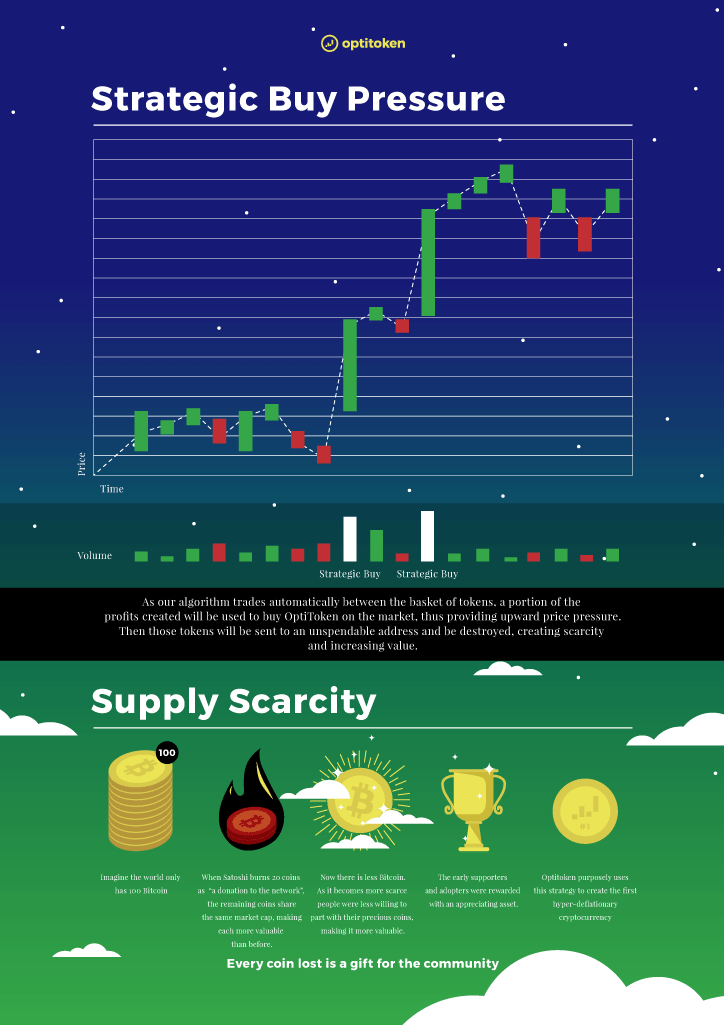 Optitokene is a hyper-deflated cryptococcus, backed by an automatic tokenized portfolio that utilizes strategic trading techniques and economic strategies for token value optimization. With this feature, Optitoken aims to optimize the utilization and application of cryptocurrency and maximize its benefits as a value transfer mechanism of your choice. Welcome to the revolutionary crypto!