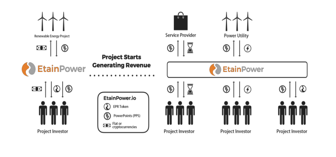 Платформа EtainPower имеет два маркера: EPR (токен платформы) и PowerPoints (PPS, токен энергии), два токена используются вместе в энергетической экосистеме на базе блок-цепи, основанной на AI. Производители возобновляемых источников энергии могут выпускать PPS и полностью финансировать проект через платформу EtainPower. Фактическая стоимость PPS равна цене электроэнергии, которую производители обязуются поставлять в будущем. На этапе финансирования проекта производитель возобновляемой энергии продает электроэнергию инвесторам в форме PPS по цене ниже фактической стоимости. Значение PPS будет активировано, когда проект будет генерировать доход.